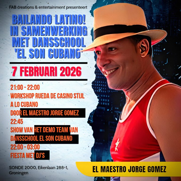 We nodigen je uit voor een complete Latin ervaring. De avond start met een Rueda de Casino workshop in Cubaanse stijl, gegeven door El Maestro Jorge Gómez
